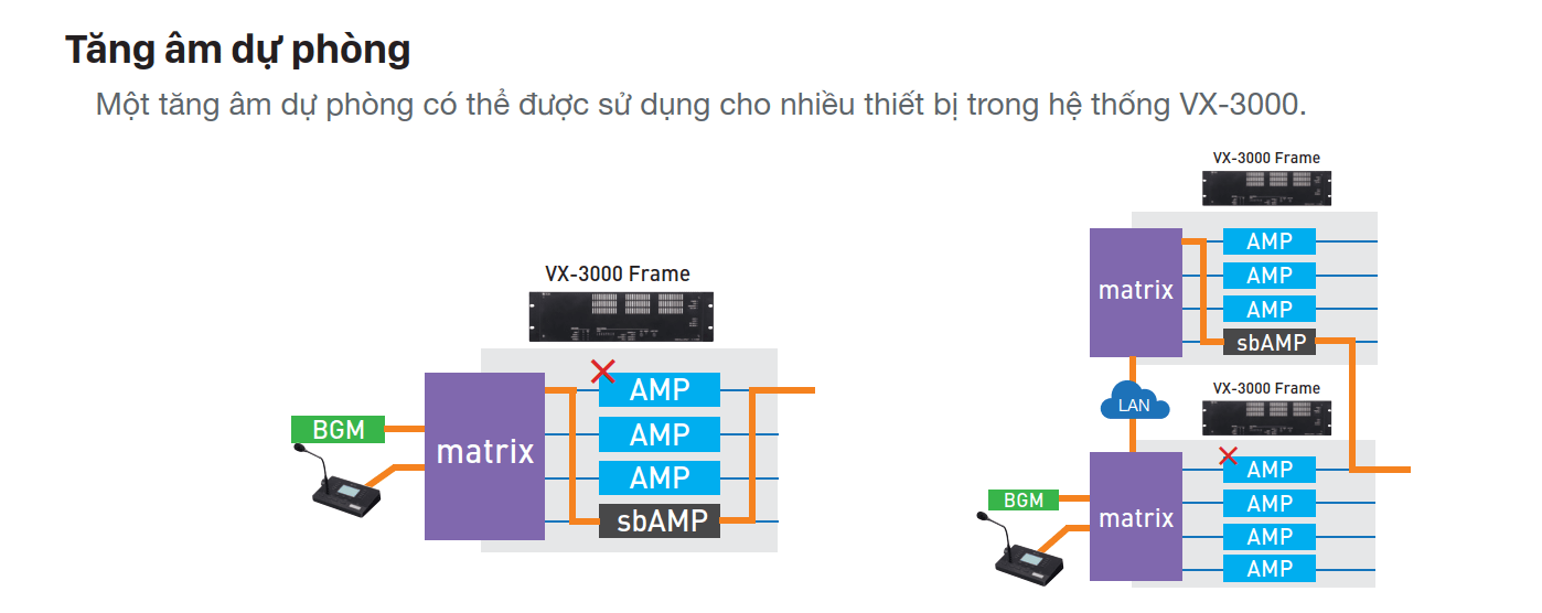 Bộ âm ly tích hợp điều khiển 4 vùng loa Tăng âm dự phòng¶ Một tăng âm dự phòng có thể được sử dụng cho nhiều thietess bị trong HỆ THỐNG VX-3000 PAGE 4 Mạng dự phòng¶ #PAGA #TOA