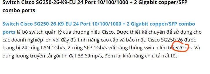 Tôi có một switch có 24 cổng LAN 1Gb/2 và 2 Cổng SFP 1Gb/s-> Tại sao băng thông switch lại là 52Gb/s? Các con số này liên hệ như thế nào.