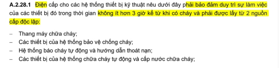 QCVN06_2022: Qui chuẩn kỹ thuật quốc gia về an toàn cháy cho nhà và công trình¶ qcvn06¶ NOTES¶ MAYBIENAP¶ mayphatdien¶ Điện cấp cho hệ PCCC phải duy trì>=3h kể từ khi có cháy¶ ^c7fb94 Theo tiêu chuẩn chiếu sáng sự cố thì chỉ cần 2h CHIẾU SÁNG SỰ CỐ#Đèn chiếu sáng sự cố và biển báo an toàn có nguồn điện dự phòng phải đảm bảo thời gian hoạt động ổn định liên tục tối thiểu 120 min khi có sự cố cháy, nổ. Hệ thống liên lạc khẩn cấp¶