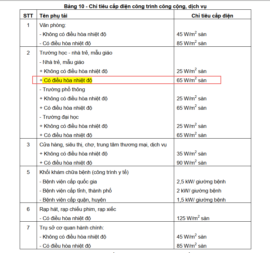 Bảng 10- Chỉ tiêu cấp điện công trình công cộng, dịch vụ¶